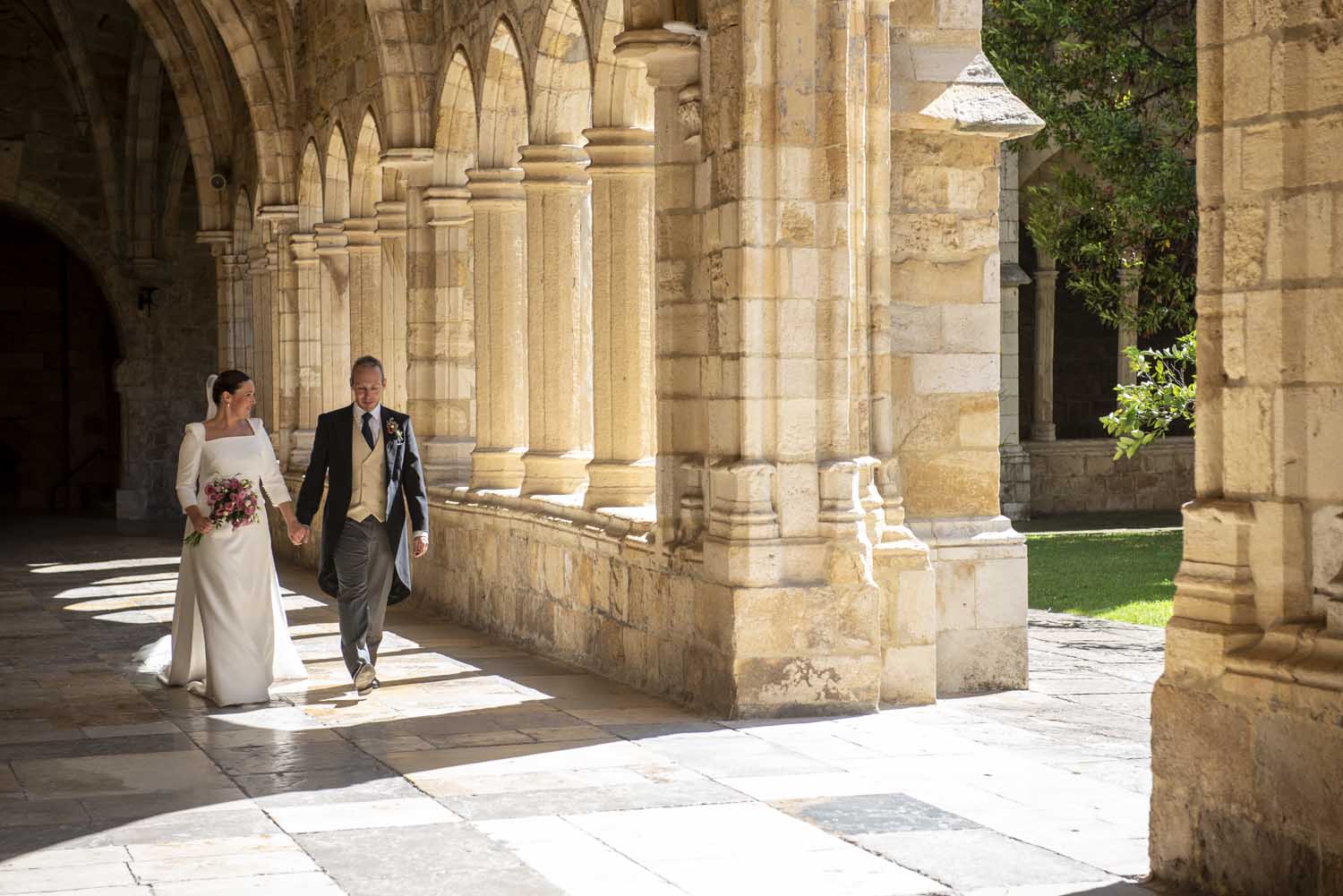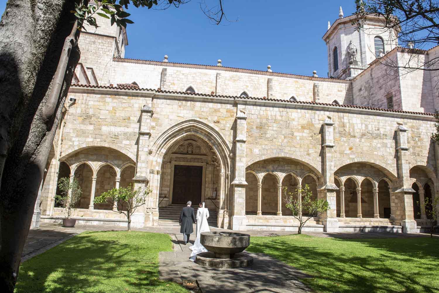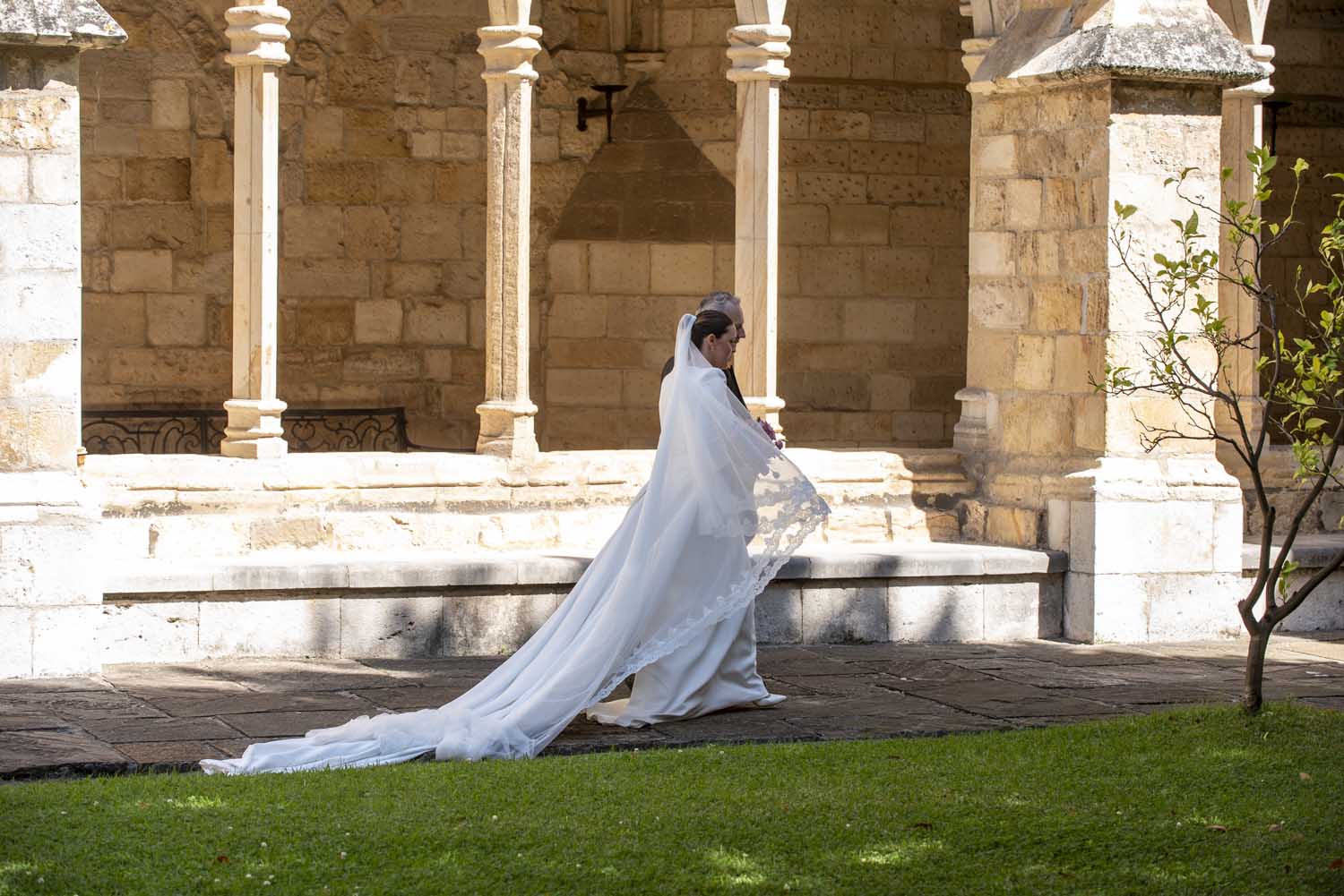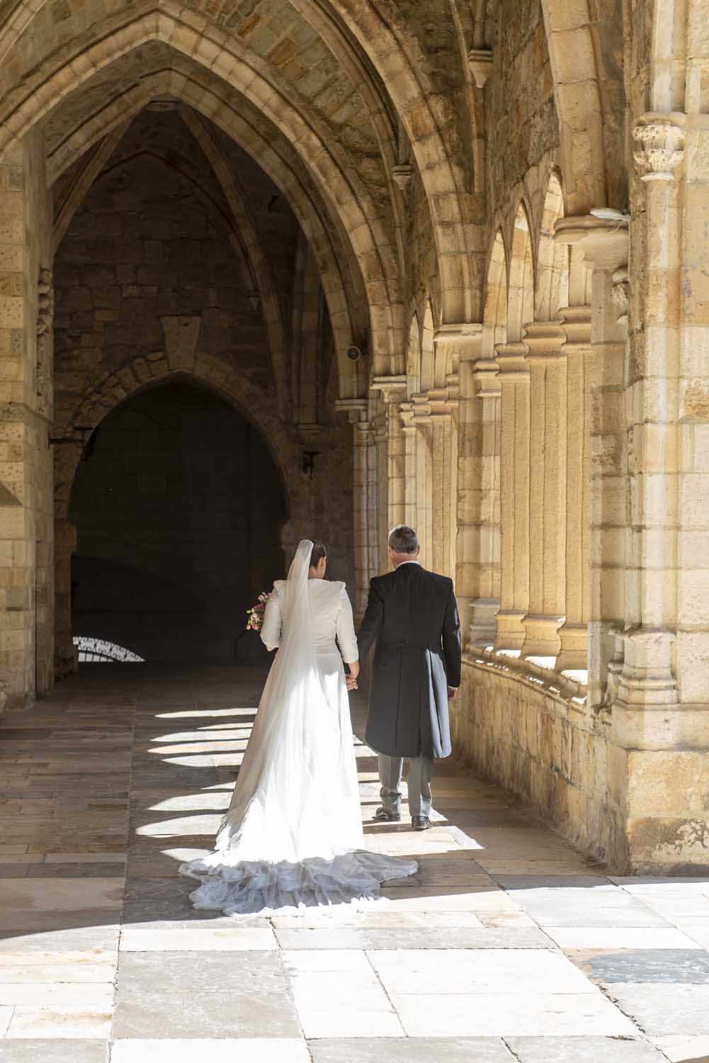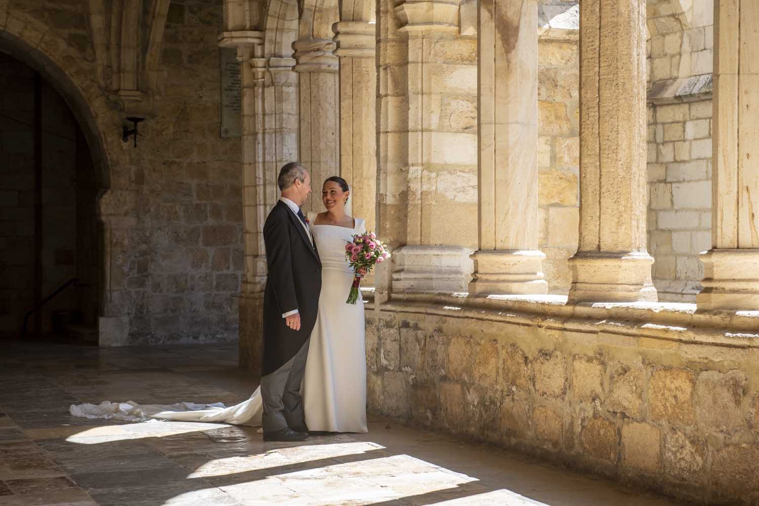Acabada la ceremonia y casi sin tiempo para recibir las felicitaciones de sus invitados, subimos al claustro de la Catedral para realizar la sesión de fotos con los recién casados en un ambiente más relajado. Este es el momento que más me gusta, el único en el que puedo pausar el ritmo frenético de la boda y disfrutar fotografiando a los novios con la calma que requiere una buena sesión de retrato. Y el claustro soleado y en silencio es el lugar perfecto para hacer bien mi trabajo.