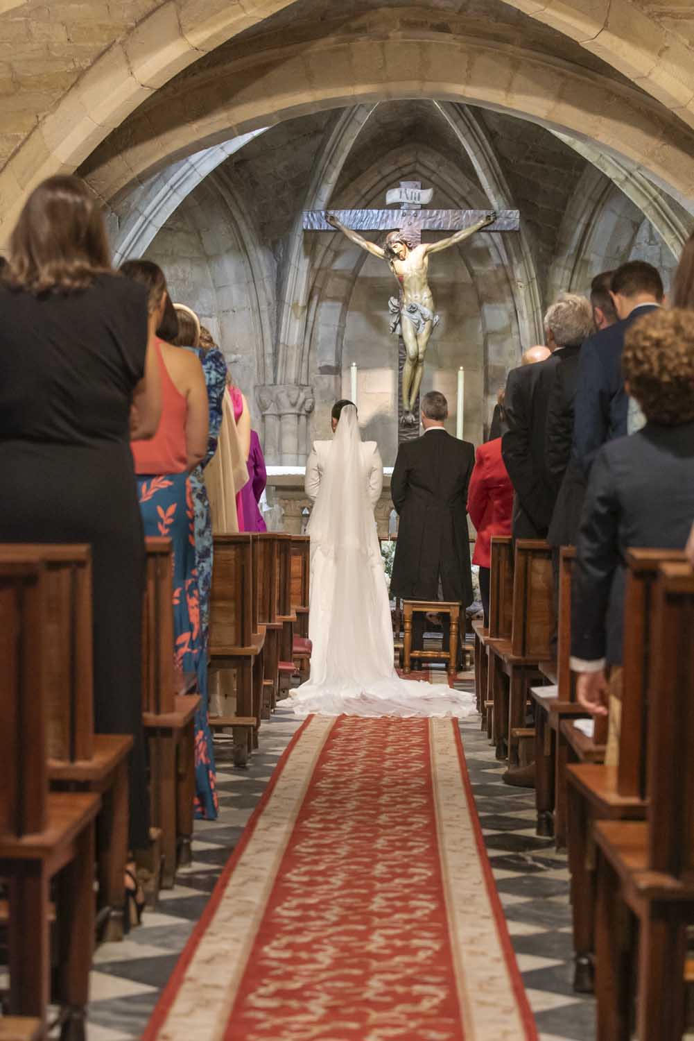 Virginia llegó puntual a bordo de un magnífico Rolls Royce para hacer su entrada en la iglesia del brazo de su padre y precedida por un cortejo de niños vestidos de “blanco con bandas azules…” En el interior ya la esperaba Miguel con su madre y madrina, para dar comienzo a la ceremonia religiosa, que fue breve y estuvo amenizada con la música del recién restaurado órgano de la iglesia.